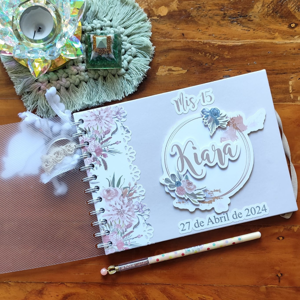 Contiene cierre con elástico en un lateral, llaverito decorativo colgando del anillado, tapa protectora al frente de polipropileno. Interior de 30 hojas blancas en opalina de 120 grs (podes elegir de borde recto , puntas redondeadas, o caladas) impresas al frente en la esquina inferior derecha con un dibujito de la temática elegida.