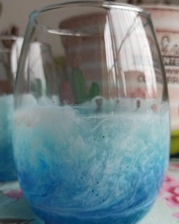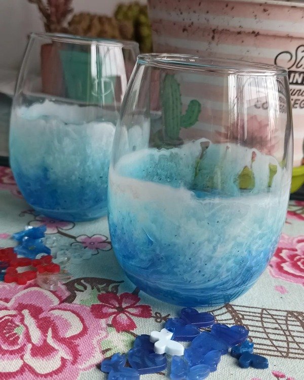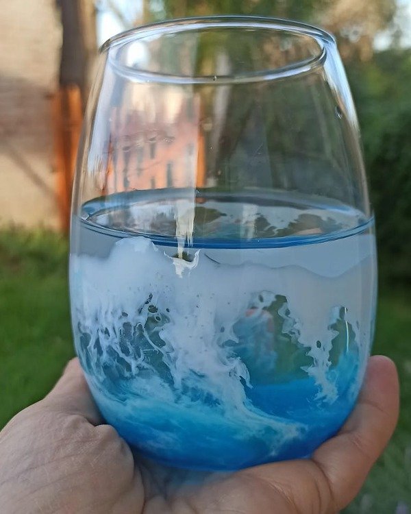 Vasos de vidrio resinados efecto mar, podes pedirlos con este mismo efecto pero del color que quieras: en gama de azules, o verdes, rosas, violetas, etc. Si querés antes de comprar, podes consultar por whatsapp las posibilidades de color, y si no lo vemos una vez realizada la compra. También tenés la opción en VARIANTES, que si no los querés con color efecto mar, pueden ir con aplicación de glitters, también podes consultar al whatsapp la variedad de colores.