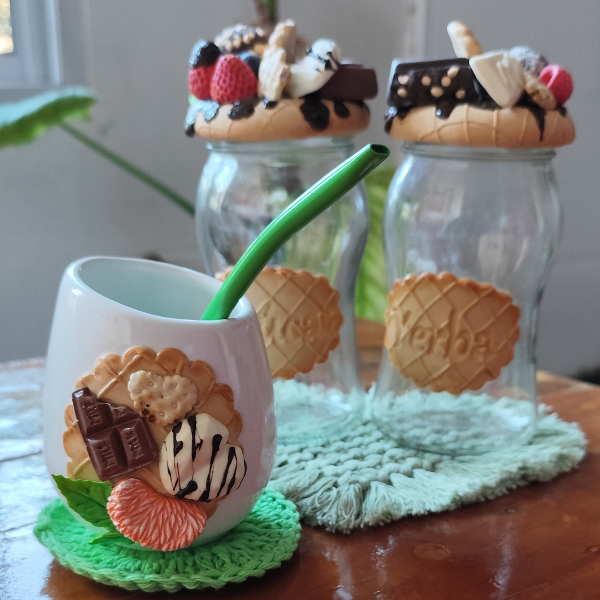 Incluye: 1 mate de cerámica c/bombilla + 2 frascos de 360cc para yerba y azúcar+ bandeja (opcional) + cucharita.